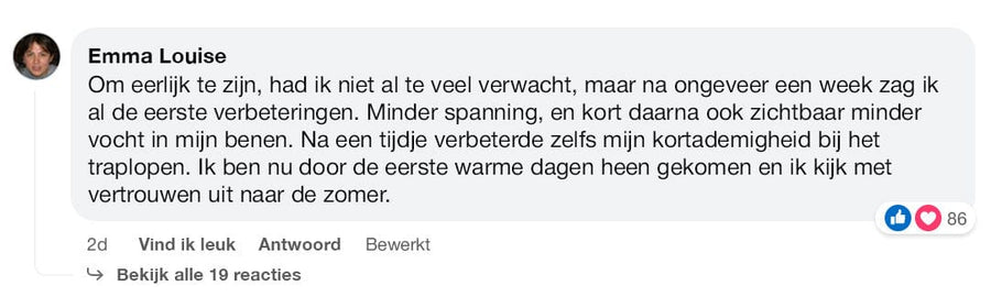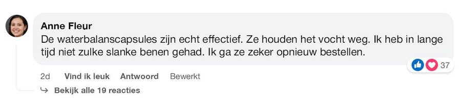 "Jarenlang worstelde ik met zwellingen in mijn benen en voeten, waardoor ik me zwaar en ongemakkelijk voelde, zonder echt te begrijpen waarom. Geen enkel dieet of trainingsprogramma leek het probleem te verlichten. Gelukkig ontdekte ik dat vochtophoping een belangrijke factor was in mijn strijd met mijn gewicht. De meest opmerkelijke verandering was in mijn energieniveau. Zonder het constante ongemak en de zwaarte van de vochtophoping voelde ik me actiever en levendiger. Ik begon te genieten van activiteiten die ik eerder vermeed vanwege het ongemak. Voor het eerst in jaren voelde ik me lichter, vitaler en gezonder. Of je nu worstelt met vochtophoping of simpelweg streeft naar een gezonder leven, dit zou wel eens het ontbrekende stuk van jouw puzzel kunnen zijn." - Fleur L.