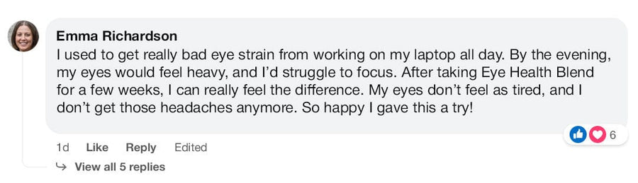 I’ve worn reading glasses for years, and I figured that was just how things were going to be. But after about six weeks of taking Eye Health Blend, I started noticing little changes, reading small text doesn’t feel as frustrating, and my eyes don’t get as tired in the evenings. It’s not some magic fix, but it’s helped enough that I’m sticking with it.
