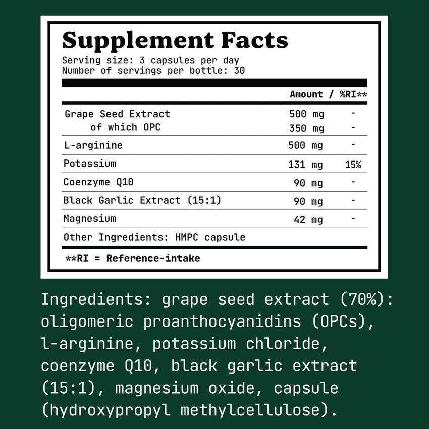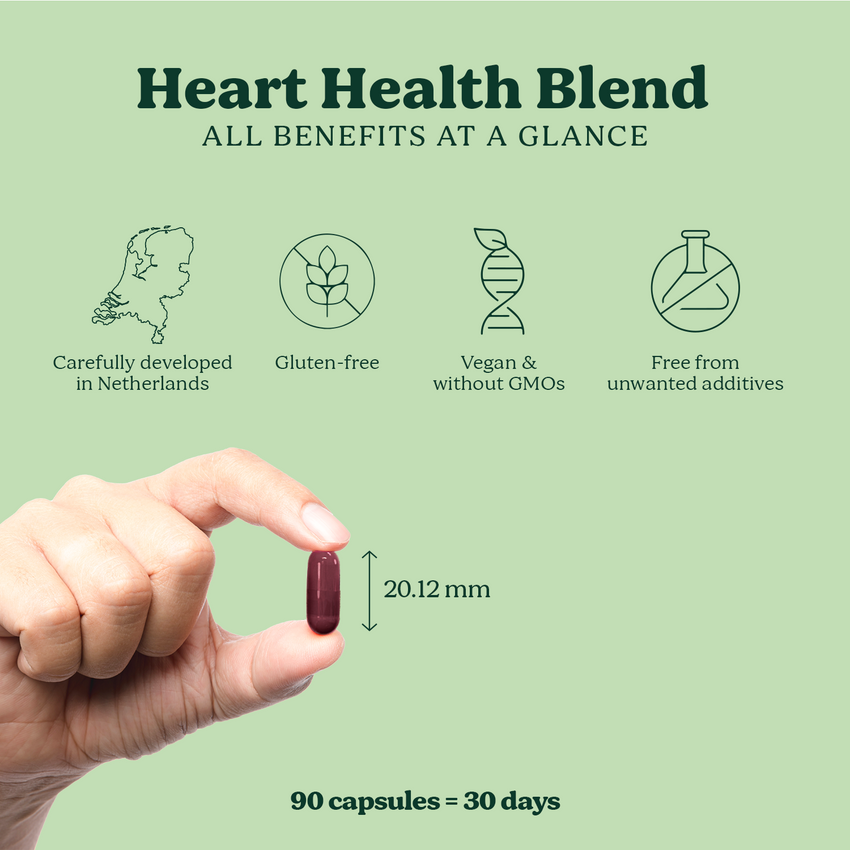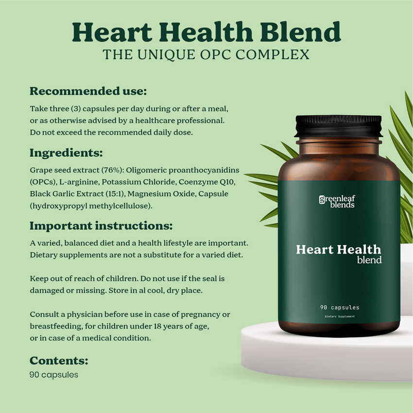 Heart Health Blend is a premium cardiovascular support formula designed to improve blood circulation and maintain overall heart function, helping to prevent future heart difficulties. It combines high-quality OPC (oligomeric proanthocyanidins) extracted from hand-picked French grapes—renowned for their powerful antioxidant properties—with bioactive coenzyme Q10, essential for heart energy and cell protection. To enhance cardiovascular synergy, the formula includes wild black garlic, sustainably fermented and gently extracted to deliver a potent 15:1 extract, providing 90 mg per daily dose from 1,350 mg of pure fermented garlic. Organically bound potassium is added to specifically support healthy blood pressure levels. Every ingredient is rigorously tested in independent laboratories to ensure maximum purity, potency, and sustainability—free from GMOs, additives, artificial colors, or animal testing. Heart Health Blend offers a clean, vegan-friendly solution to naturally protect your heart and promote healthy circulation before problems arise.