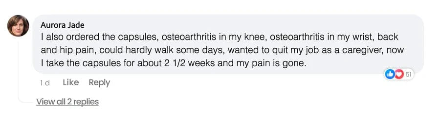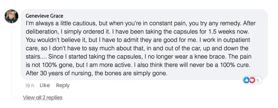 Since I started using Joint Relief my life has really changed. The severe knee pain that previously hindered my daily movements is now almost a distant memory. After just a few weeks I noticed significant progress; the pain has decreased significantly, so I can now walk effortlessly again. I absolutely love Joint Relief and highly recommend it to anyone struggling with joint pain. This product has truly transformed my life, and I am extremely happy that I made the decision to give Joint Relief a try.