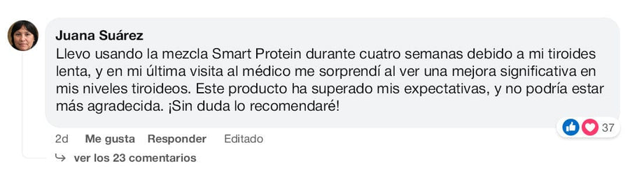Desde que comencé a usar la mezcla Smart Protein, diseñada específicamente para personas con tiroides poco activa, mi vida ha dado un giro completo. Antes me sentía constantemente cansada y no tenía energía suficiente para afrontar el día. Sin embargo, tras unas semanas de uso, he notado un cambio radical en mi bienestar. Mis niveles de energía han aumentado de manera notable y mi salud en general ha mejorado mucho. De forma inesperada, este producto también ha apoyado mi proceso de pérdida de peso, en el que llevaba años sin éxito. Estoy muy emocionada por estos cambios positivos y recomendaría encarecidamente la mezcla Smart Protein a cualquiera con problemas de tiroides. Ha marcado una diferencia enorme en mi vida, y no podría estar más agradecida de haberle dado una oportunidad.