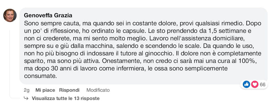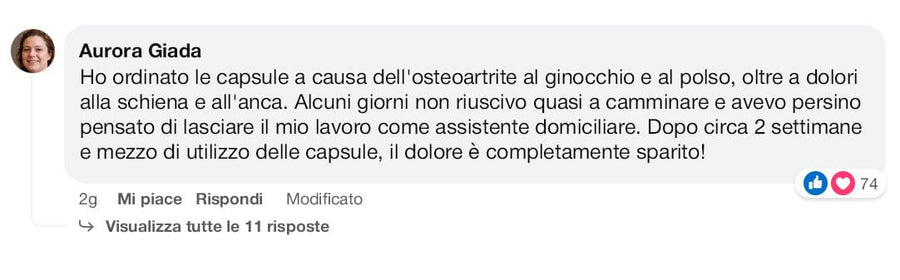 “Assolutamente consigliato. Ho l'osteoartrite alle dita e ai polsi e dopo aver assunto 3 capsule al giorno per circa 2 settimane, ho notato già un netto miglioramento. La rigidità al mattino è ora minima e anche i noduli sulle articolazioni delle dita si sono ridotti. Le prendo sempre, così devo ricorrere all'ibuprofene e al Voltaren solo in casi di emergenza. È sicuramente una buona alternativa a tutti i farmaci. Inoltre li tollero molto bene." - Elga A.