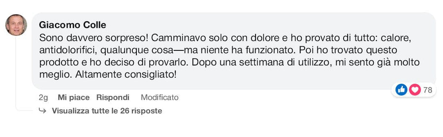 Da quando ho iniziato a usare Joint Relief la mia vita è davvero cambiata. Il forte dolore al ginocchio che prima ostacolava i miei movimenti quotidiani è ora quasi un lontano ricordo. Dopo poche settimane ho notato progressi significativi: il dolore è diminuito notevolmente e ora posso di nuovo camminare senza sforzo. Adoro Joint Relief e lo consiglio vivamente a chiunque stia lottando contro i dolori articolari. Questo prodotto ha davvero trasformato la mia vita e sono estremamente felice di aver deciso di provarlo.