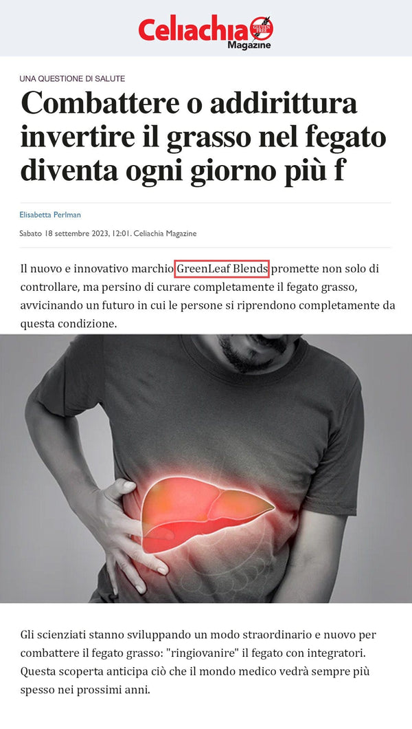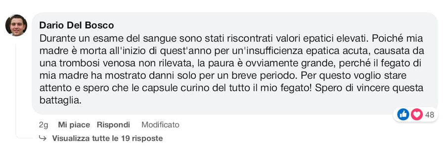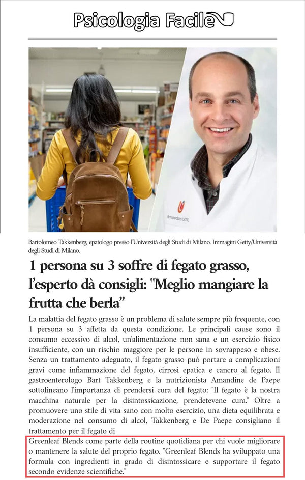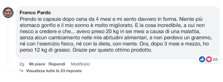 “Voglio condividere la mia esperienza con il blend Liver Detox perché non solo mi ha aiutato a perdere peso, ma ha anche contribuito significativamente al mio benessere generale. Per anni ho lottato con i chili in eccesso e mancanza di energia, senza capire davvero il perché. Nessuna dieta o allenamento sembrava funzionare. Fortunatamente, ho scoperto che la malattia del fegato grasso aveva un ruolo importante nella mia lotta contro i chili di troppo. Dopo aver iniziato a usare il blend Liver Detox, ho notato rapidamente un cambiamento. È stato come se il mio corpo avesse finalmente iniziato a rispondere alle mie scelte di vita sana. I chili di troppo hanno iniziato a sparire e i miei livelli di energia sono saliti alle stelle. Per la prima volta dopo anni, mi sono sentito non solo più leggero, ma anche più energico e sano. Comprendere che la malattia del fegato grasso può avere un impatto così grande sulla perdita di peso e sulla salute generale è stata una rivelazione per me. Ecco perché ora sento un forte bisogno di condividere la mia storia e informare gli altri sull'importanza della salute del fegato. Il blend Liver Detox ha cambiato la mia vita e credo sinceramente che possa aiutare anche gli altri. Che tu stia lottando per perdere peso o semplicemente cercando di vivere in modo più sano, questo potrebbe essere il tassello mancante nel tuo puzzle.” - Marco W.