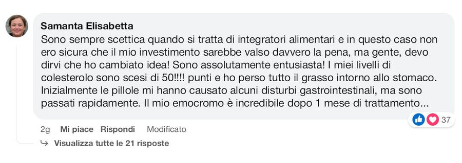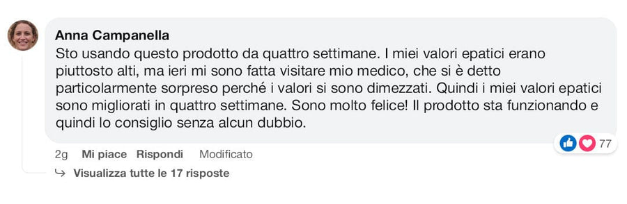 "Assolutamente consigliato. Stavo lottando con la malattia del fegato grasso, che ostacolava la mia perdita di peso. Dopo circa 2 settimane di assunzione continua di 2 capsule al giorno del blend Liver Detox, ho già notato un miglioramento significativo. La stanchezza che mi affliggeva ogni mattina ora è quasi impercettibile e il mio benessere generale è migliorato notevolmente. Continuo a prenderle, così non devo più ricorrere a snack poco salutari. Il mio corpo le tollera molto bene e non ho riscontrato effetti collaterali." - Gilda Giambona