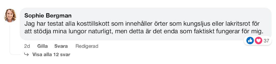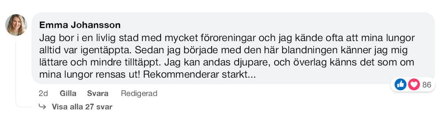”Jag har alltid varit särskilt känslig för miljöirriterande ämnen, vilket ledde till ihållande hosta och andnöd som verkligen påverkade mitt dagliga liv. Jag letade efter ett naturligt botemedel, och den här blandningen har varit en uppenbarelse! Den är både mild och anmärkningsvärt effektiv. Jag kan känna att mina lungor rensas upp efter år av obehag. Jag uppskattar hur den stödjer min kropp på ett naturligt sätt, utan att förlita sig på starka kemikalier. Jag skulle definitivt rekommendera den till alla som söker lindring.” - J Berglund