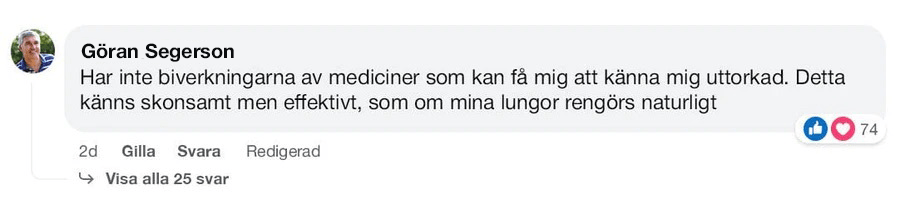 ”Trots att jag testat många naturläkemedel för att förbättra min andning hade inget någon större effekt förrän jag upptäckte just den här blandningen. Det känns som om mina lungor får den näring de länge har behövt. Förbättringarna är går ej att missa: mindre stramhet, lättare att ta djupa andetag och morgnar utan täppthet. Den här blandningen har verkligen förändrat mitt dagliga liv.” - Lisa Bergström
