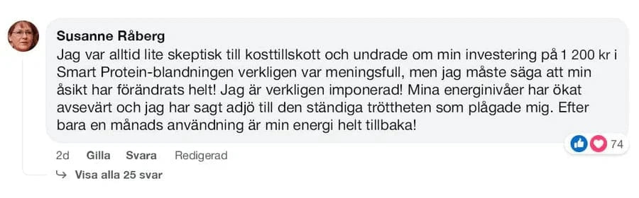 Jag har kämpat med kronisk trötthet i flera år. Efter att jag började ta Smart Protein Blend för tre månader sedan känner jag mig betydligt piggare. Även om jag glömmer att ta det en dag märker jag skillnaden direkt. Så jag kommer definitivt att fortsätta!