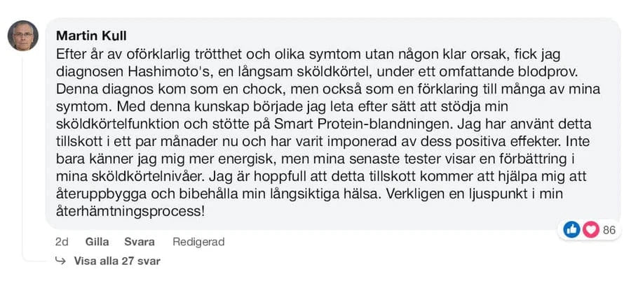 På inrådan av min läkare började jag ta Smart Protein Blend för att stödja mina sköldkörtelproblem och är mycket imponerad av resultaten. Efter bara några veckor märkte jag en betydande förbättring och jag kände mig mer energisk. Efter fem månaders användning har min hälsa förbättrats avsevärt. Jag är extremt nöjd med mitt beslut att använda Smart Protein Blend och kan rekommendera den till alla som vill förbättra sin sköldkörtelfunktion. Med vänlig hälsning, Peter.